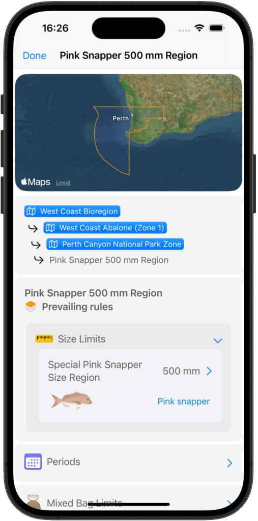 At its core, FishOz features a fishing rules engine that automatically applies regulations based on your personal context. Simply enter your fishing license(s), choose your fishing platform (boat, land, spearfishing, etc.), and add your fish to your catch bag.